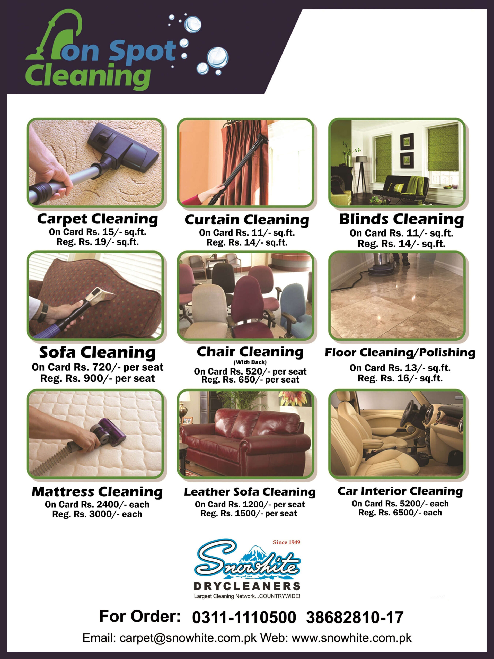 Similarly our “ON-SPOT” carpet cleaning services we which employs new technique of jet steam for cleaning, shampooing and drying carpets on their very sites at your office, home which has attained higher popularity levels in Pakistan.